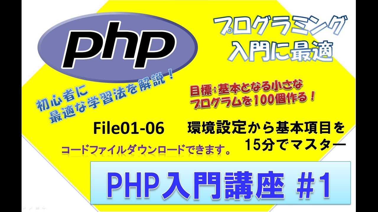 初心者向けプログラミング入門に最適なPHPの解説、環境設定から基本区目を15分で解説、コードファイルはダウンロードできるので多少の改造を行いながら効率的に学習できます。